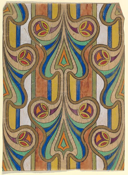 Vertical Panel with a Pattern of Butterfly-Shaped Designs on a Striped Background, from a group of 158 textile designs from an unidentified French designer. The designs include brightly colored patterns and single motifs in late Art Nouveau and Art Deco styles. Most designs have been made on tracing paper and show signs of transfer. Some include instructions for execution, written in French.