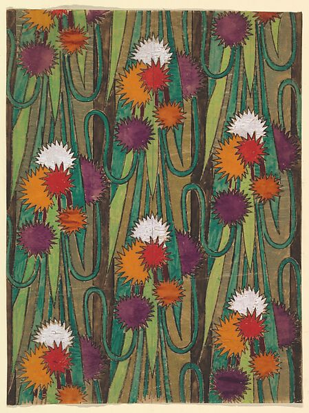 Vertical Panel with a Repetitive Pattern of Groupings of Decorative Flowers, Forming Rows Connected by Vines, from a group of 158 textile designs from an unidentified French designer. The designs include brightly colored patterns and single motifs in late Art Nouveau and Art Deco styles. Most designs have been made on tracing paper and show signs of transfer. Some include instructions for execution, written in French.