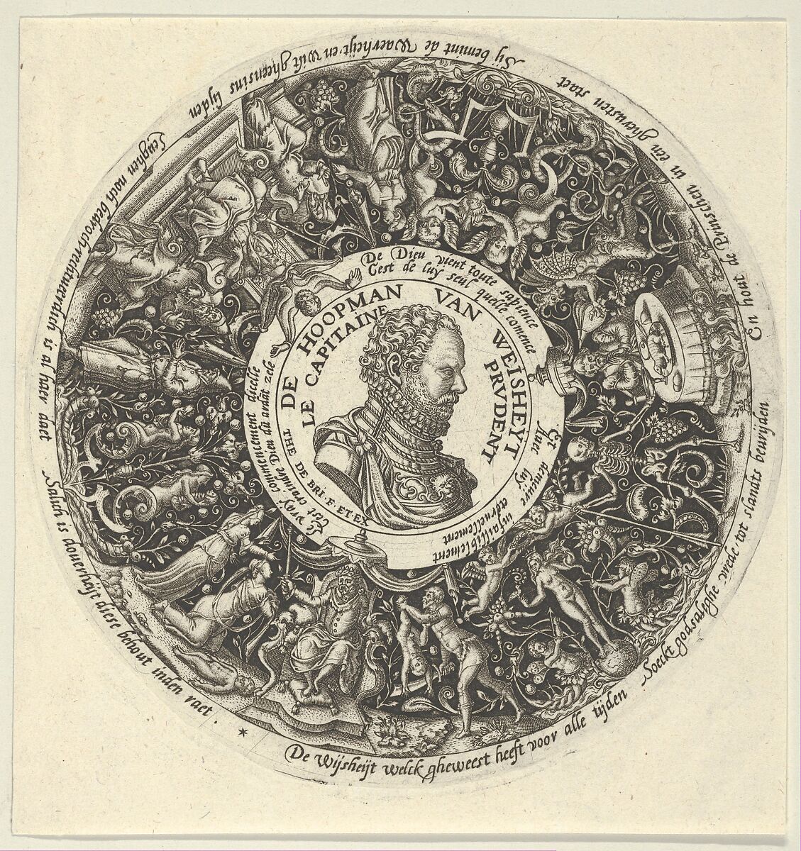 In the central medallion, a portrait of William I of Orange as Commander of Wisdom, shown in profile facing right, framed by circular ornamental frieze. Depicted in the frieze below the medallion, a scene with the Judgement of Solomon.