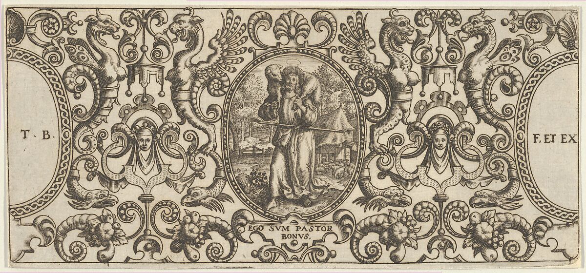A scene with the Good Shepherd framed in an oval at center, surrounded by symmetrical ornamental design with masks, grotesques, and cornucopias. At the left and right edge, segmented ovals with artist's signature. Associated with the series, Grotisch fur alle Kunstler, consisting of four plates.