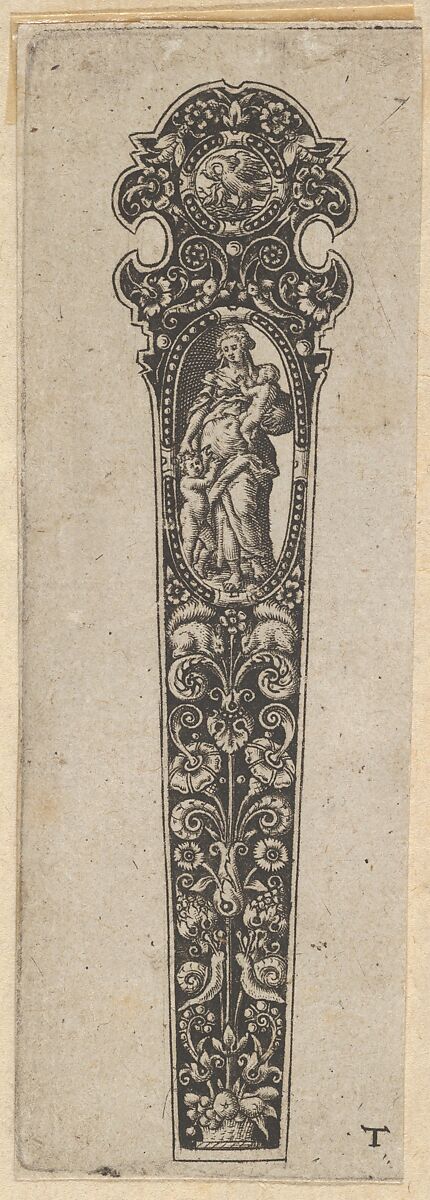 Design for a knife handle with Charity personified as a full-length female figure holding a child in her left arm and another at her right side, in an oval, above a candelabrum with squirrels and snails in blackwork.