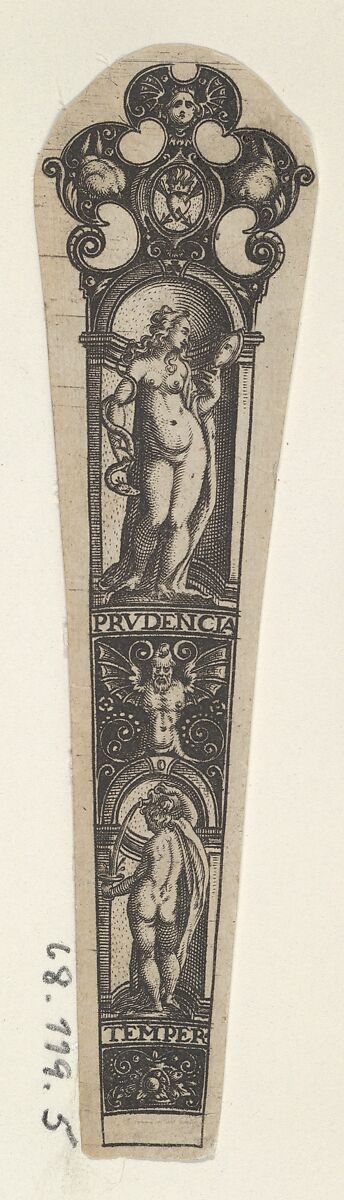 Design for a knife handle with Prudence personified as a full-length female figure looking into a mirror at her left, under an arch. Below, the personification of Temperance is shown pouring water from a jub, also framed by an arch.