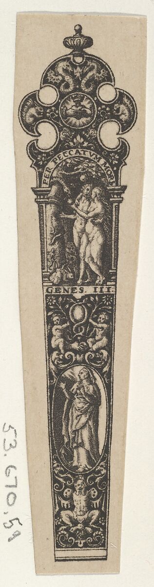 Panel with two knife handle designs, both with scenes under arches at top. The motif at left shows Adam and Eve tempted by the snake, after a design by Heinrich Aldegrever (Bartsch VIII.363.3). The scene at right shows a man with a rose before the seated figure of Death, shown as a skeleton, and is based on a design by Jan Saenredam after Hendrik Goltzius (Bartsch III.258.123). Both designs have a blackwork background with grotesques. From a series of twelve plates.