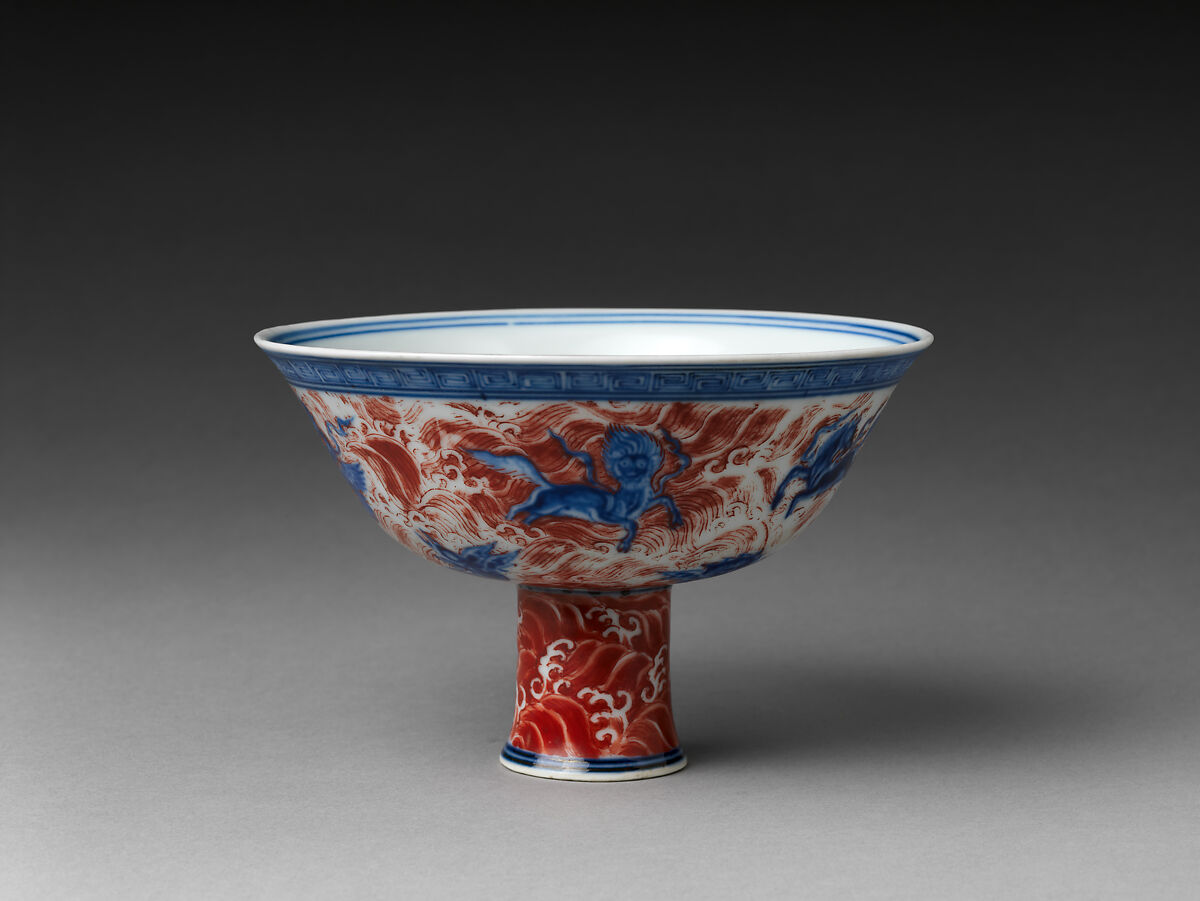 - Medium: Porcelain painted with cobalt blue under and red enamel over transparent glaze (Jingdezhen ware)