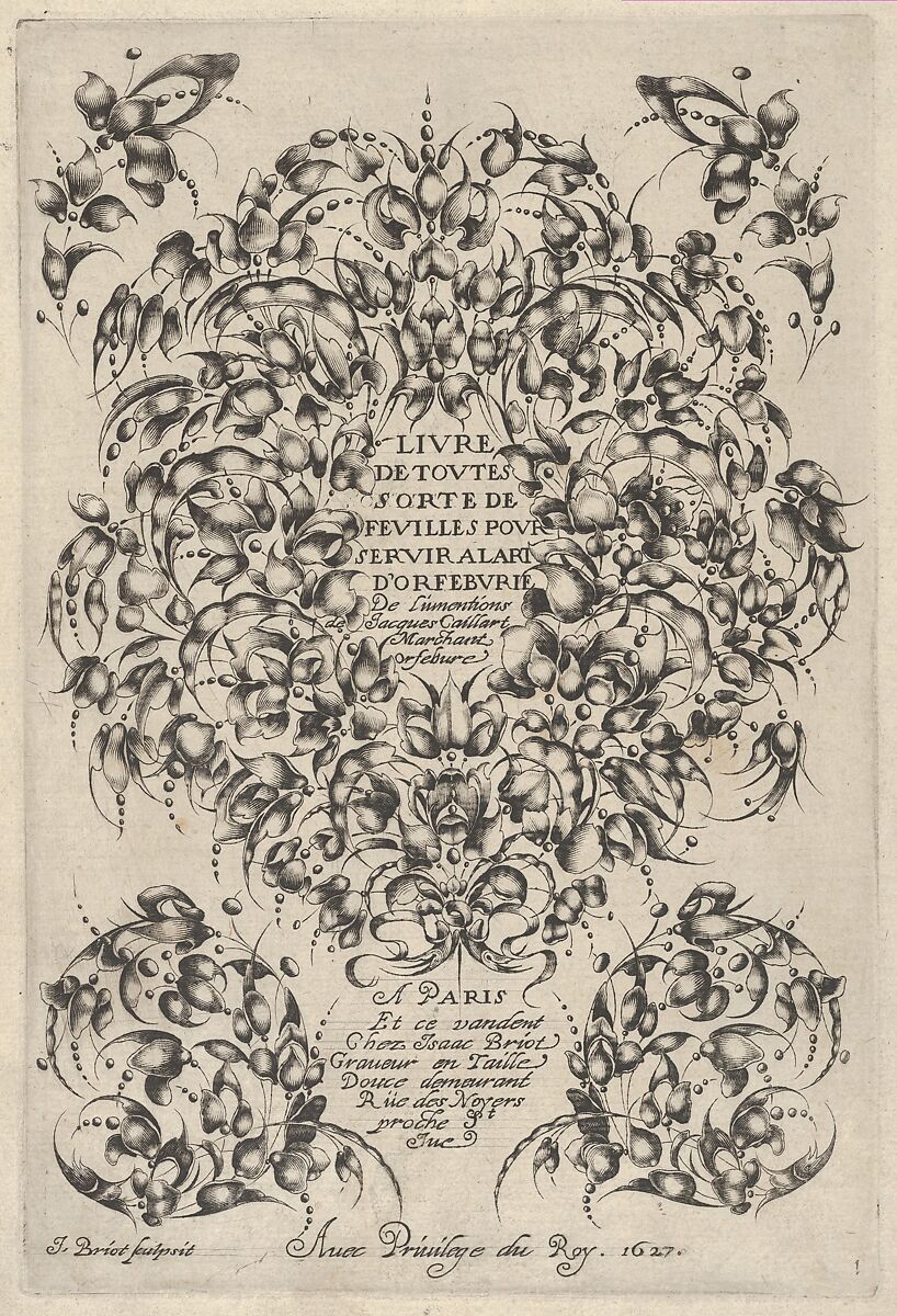 Goldsmiths' bouquet with the title in a wreath composed of decorative flowers and leaves. Text continues at bottom, flanked by C-scrolls. From a series of six plates by Caillard, published by Briot in Paris in 1627. Another edition was published in Paris in 1629, as well as a series of reverse copies in Dutch, engraved by Willem Hondius and published in 1628.
