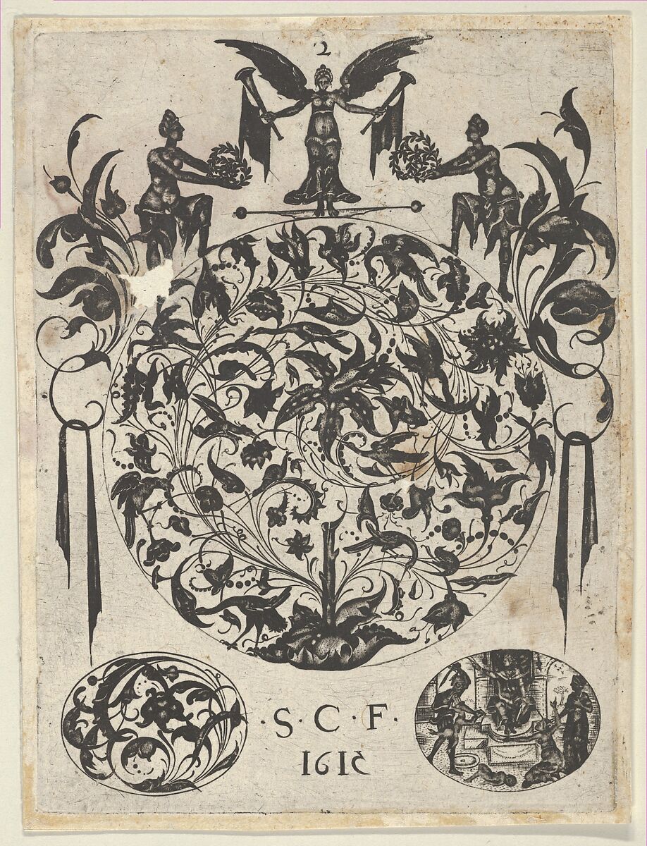 Blackwork design with a roundel at center with birds perched on tendrils, stylized flowers, and pea-pod elements. On top, a winged female figure holds two horns and is presented with wreaths. At bottom left, an oval with foliate scrolls. At bottom right, an oval with the Judgment of Solomon. Plate 2 from a series of eight plates published in Châtillon-sur-Chalaronne (Ain) with blackwork designs for goldsmiths' work.