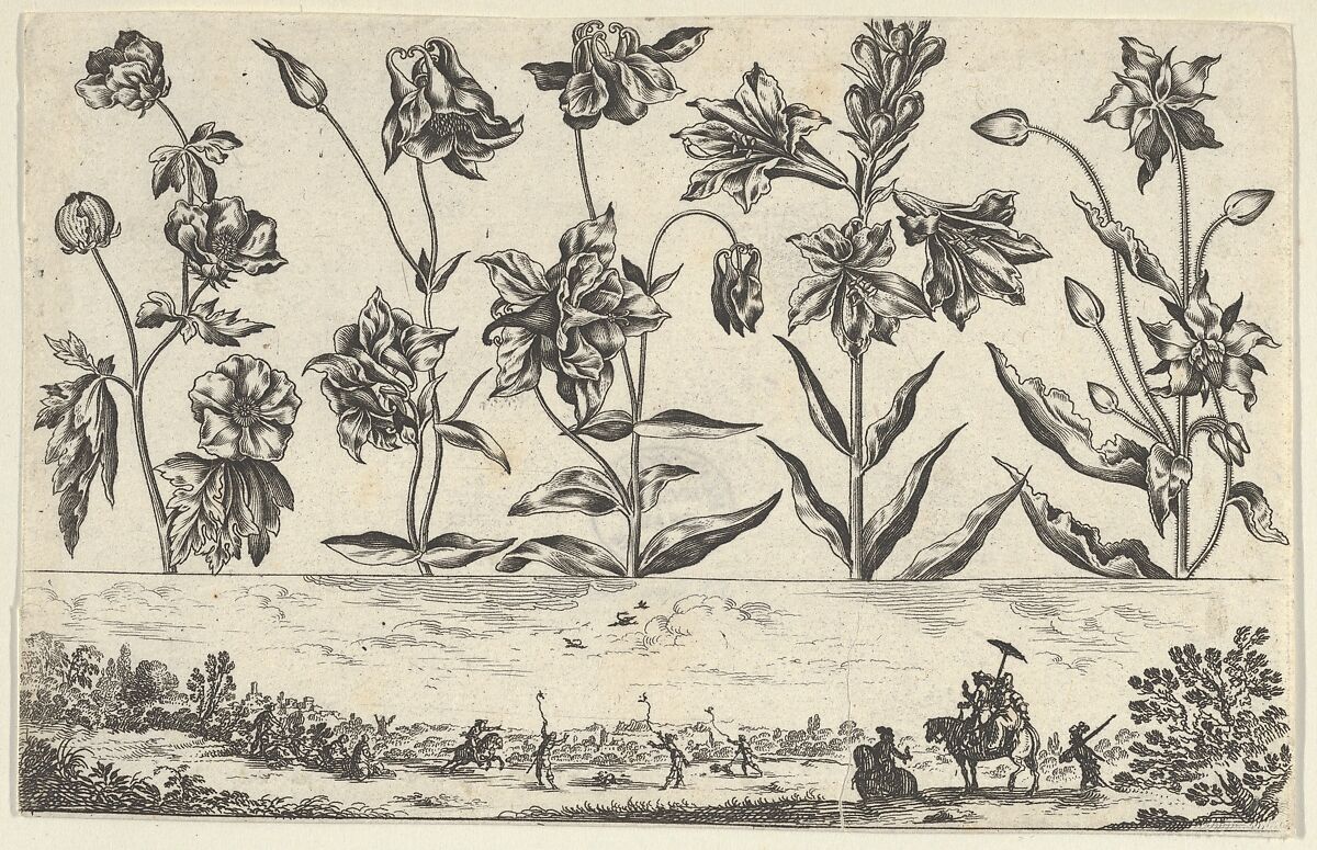 At top, a horizontal panel with a row of flowers. Below, a frieze with a hunt in a landscape with figures on horseback under a parasol at right. From a series of twelve plates with rows of flowers above friezes with landscapes, etched by Cochin, published by Balthazar Moncornet in Paris in 1645, and dedicated to the goldsmith, Jean de Leins. The prints are executed in a combination of etching, for the landscape, and burin, for the flowers.