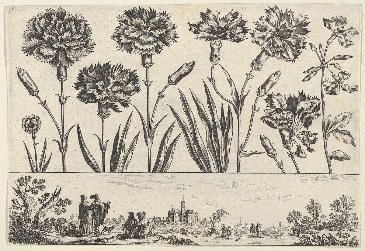 At top, a horizontal panel with a row of flowers, most of which are carnations. Below, a frieze with figures in a landscape. At left, a standing couple and a seated couple. In the background at center, a castle. From a series of twelve plates with rows of flowers above friezes with landscapes, etched by Cochin, published by Balthazar Moncornet in Paris in 1645, and dedicated to the goldsmith, Jean de Leins. The prints are executed in a combination of etching, for the landscape, and burin, for the flowers.