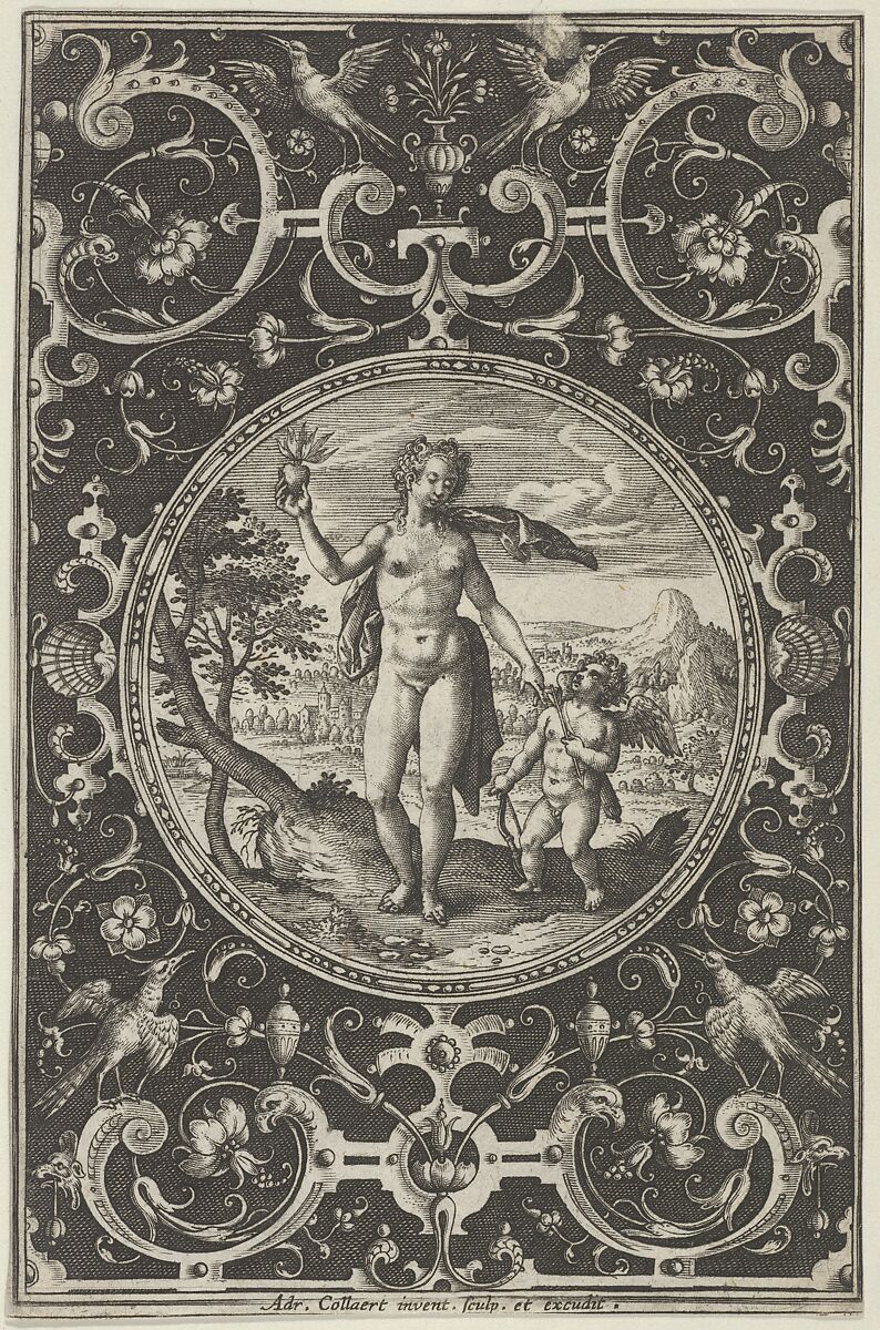 Plate 4 from a series of six devoted to the figures in the mythological story of the Judgment of Paris. Vertical panel with Venus reaching out to Cupid, set in a landscape in a medallion at center. The nude figure of Venus holds up an apple in her right hand, while gesturing down to the figure of Cupid at her left. Surrounding the medallion, a dark background with grotesque ornament, including a vase flanked by outward-facing birds at top center.