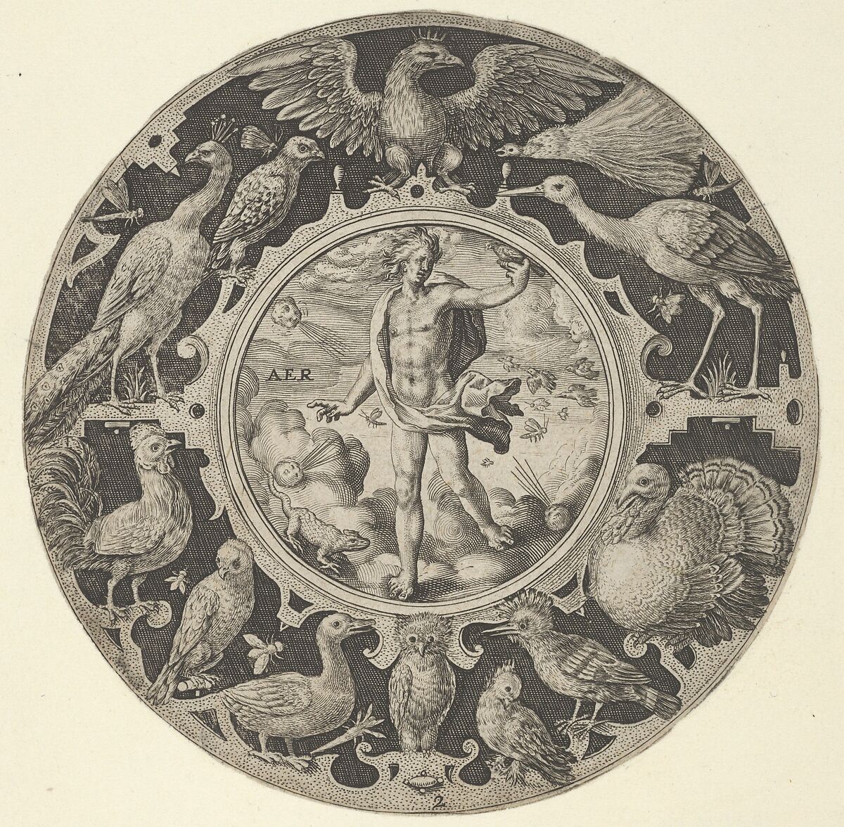 Design for a circular plate with the element of Air personified as a figure with a bird perched on his left hand at center. The figure is set in clouds, where four putti heads blow wind towards the center from each corner. This scene is surrounded by a broad band with various birds, including an owl below and a crowned eagle above. Plate 2 from a series of four devoted to the Four Elements.