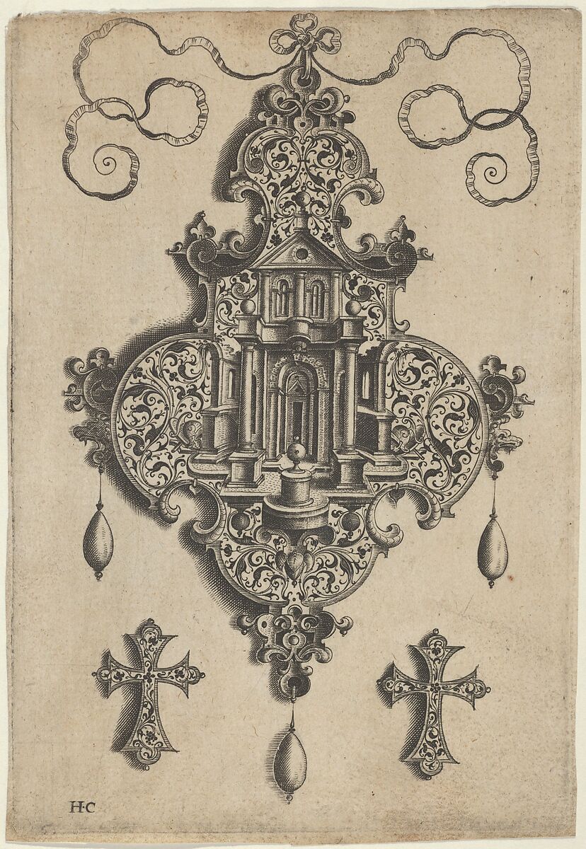 Vertical panel with pendant design at center with the facade of a temple with a vase on a pedestal, with a vegetal-arabesque pattern. The pendant hangs from a ribbon and has three pearls descending below. At bottom left and right, cross-shaped earrings or buttons, also with arabesque design. From a set of ten plates with pendant designs incorporating arabesque decoration. This plate belongs to the first edition, published by Hans I Liefrinck in Antwerp before 1573.