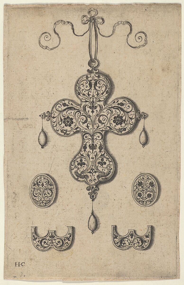 Vertical panel with the design for the verso of a pendant at center in the shape of a cross with an arabesque pattern. At bottom left and right, oval ornaments above axe-shaped ornaments, possibly designs for earrings or buttons. The pendant hangs from a ribbon and has three pearls descending below. From a set of ten plates with pendant designs incorporating arabesque decoration. This plate belongs to the first edition, published by Hans I Liefrinck in Antwerp before 1573.