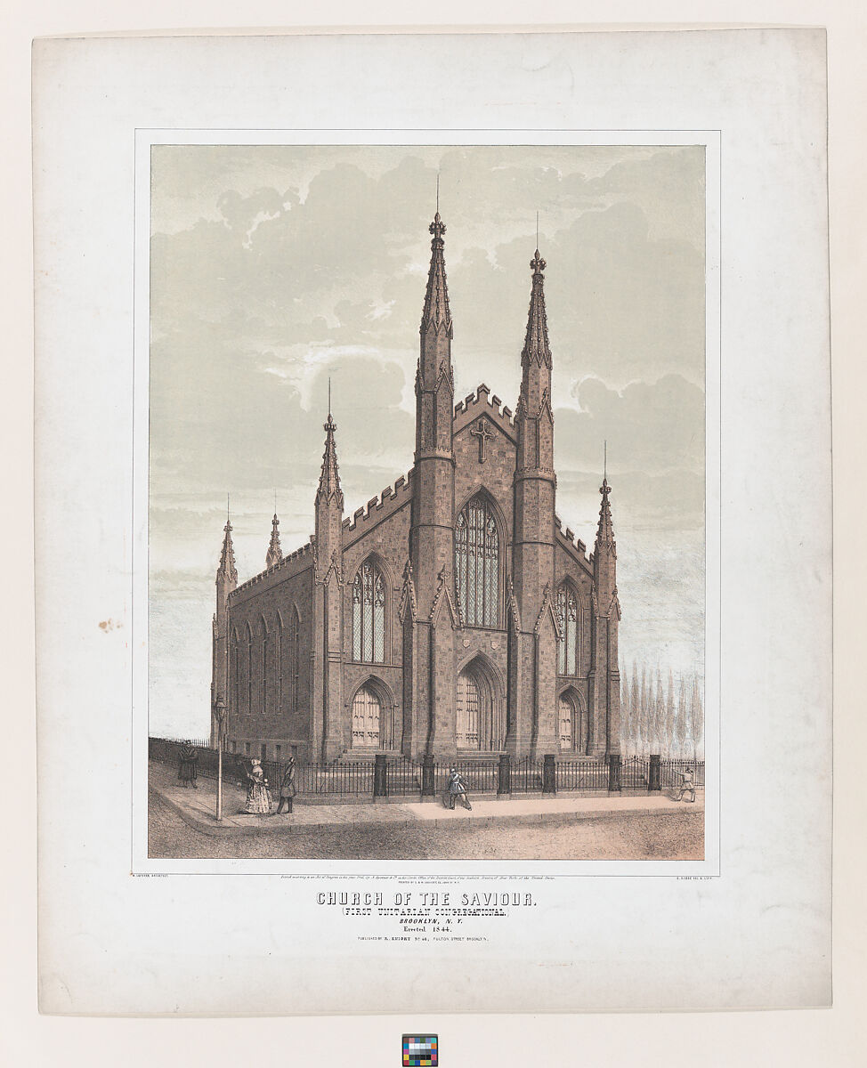 This view of the First Unitarian Congregational Church, erected in 1844 on Pierrepont Street, near the corner of Monroe Place in Brooklyn Heights, presents a stately Gothic Revival building (surrounded by a grill fence). Five pedestrians walk on the sidewalk bordering the front and side of the building, which stands majestically outlined by the sky. The print --this impression colored in lovely pinkish tones to indicate the colors of the street, sidewalk and dark sandstone of the church-- was published shortly after the church was dedicated. Designed by Minard Lafever, the architect of several distinctive churches built in New York City from 1830 to 1850, was trained as a carpenter while he studied the rudiments of architecture. During his career, Lafever published practical instruction books for builders, in addition to designing actual buildings. While he helped to promote the Greek Revival architectural style, it was his splendid Gothic Revival churches in Brooklyn that brought him acclaim. The most outstanding example was the one depicted here dedicated as the Church of the Savior. The church building still exists today in active use by its religious community.