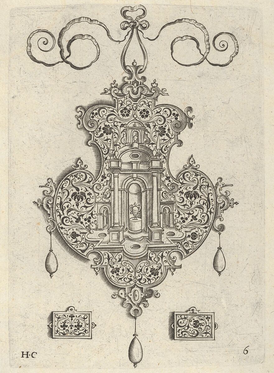 Vertical panel with a design for a pendant with an arabesque pattern. At center of the pendant, a niche with a two-handled vase on a pedastal. At bottom, two horizontal ornaments, possibly designs for earrings or buttons. The pendant hangs from a ribbon and has three pearls descending below. From a set of ten plates with pendant designs incorporating arabesque decoration. This plate belongs to the third edition, published by Theodoor Galle in Antwerp in 1604.