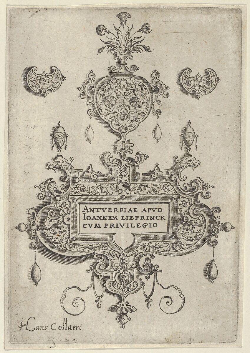 Vertical panel with pendant design at center with the text on a cartouche set in an ornament with a flower-arabesque pattern. The ornament is topped by a vase-shaped motif with flowers growing above, and is flanked by axe-shaped motifs. From a set of ten plates with pendant designs, five of which show deities in niches. The four other designs are decorated with ornate flower-arabesques and are most likely designs for pendant versos. This plate belongs to the first edition of the series, published by Hans I Liefrinck in Antwerp before 1573. Jan Collaert I produced several series of plates with pendant designs, a practice continued by his son, Adriaen Collaert.