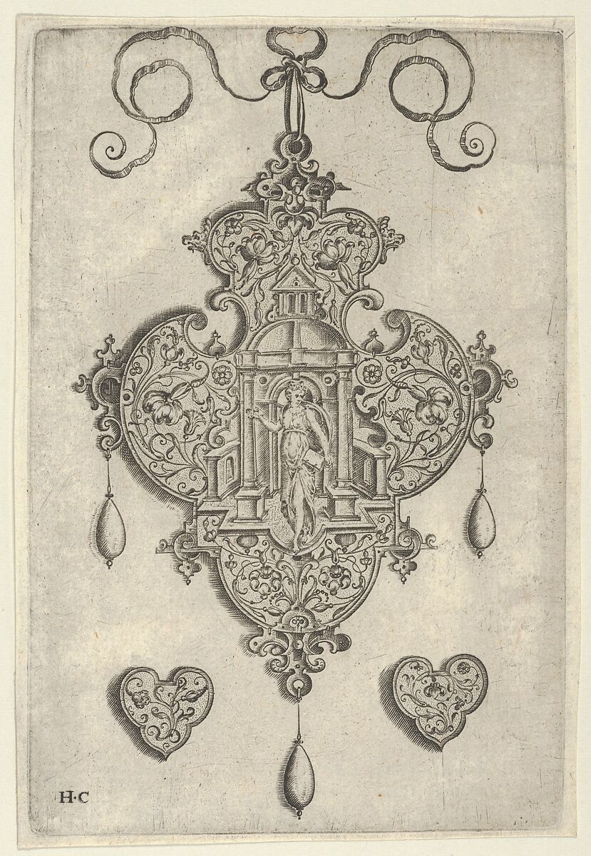 Vertical panel with a pendant design at center, decorated with the personification of Faith standing in a circular temple, surrounded by a flower-arabesque pattern. The ornament hangs from a ribbon and has three pearls descending from the lower arms. At bottom left and right, heart-shaped ornaments that may have been designs for earrings or buttons. From a set of ten plates with pendant designs, five of which show deities in niches. Four designs in the series are decorated exclusively with ornate flower-arabesques and are most likely designs for pendant versos. This plate belongs to the first edition, published by Hans I Liefrinck in Antwerp before 1573. Jan Collaert I produced several series of plates with pendant designs, a practice continued by his son, Adriaen Collaert.