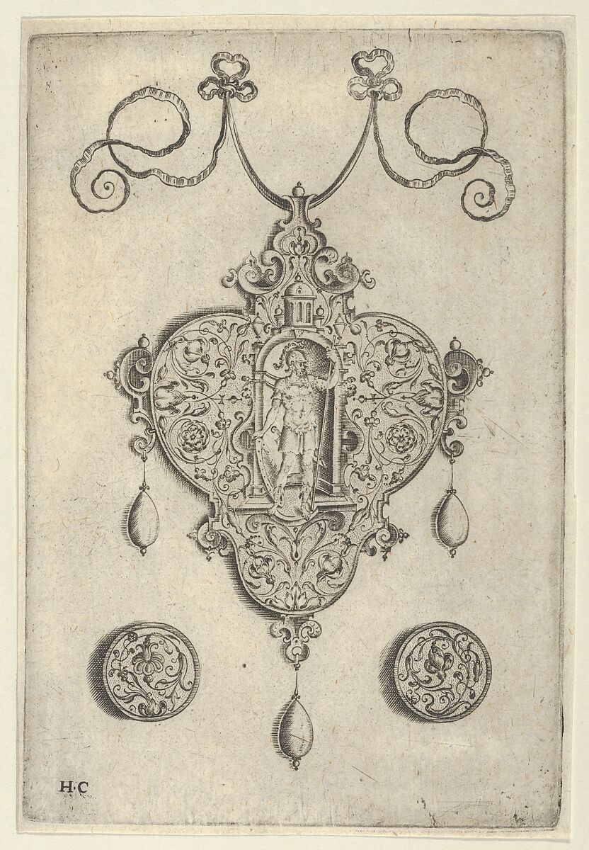 Vertical panel with a pendant design at center, a scene containing the figure of Mars, wearing a helmet and holding a spear, under a niche at center and surrounded by a flower-arabesque pattern. The ornament hangs from a ribbon and has three pearls descending from the bottom and left and right sides. At bottom left and right, circular ornaments that may have been designs for earrings or buttons. From a set of ten plates with pendant designs, five of which show deities in niches. Four designs in the series are decorated exclusively with ornate flower-arabesques and are most likely designs for pendant versos. This plate belongs to the first edition, published by Hans I Liefrinck in Antwerp before 1573. Jan Collaert I produced several series of plates with pendant designs, a practice continued by his son, Adriaen Collaert.