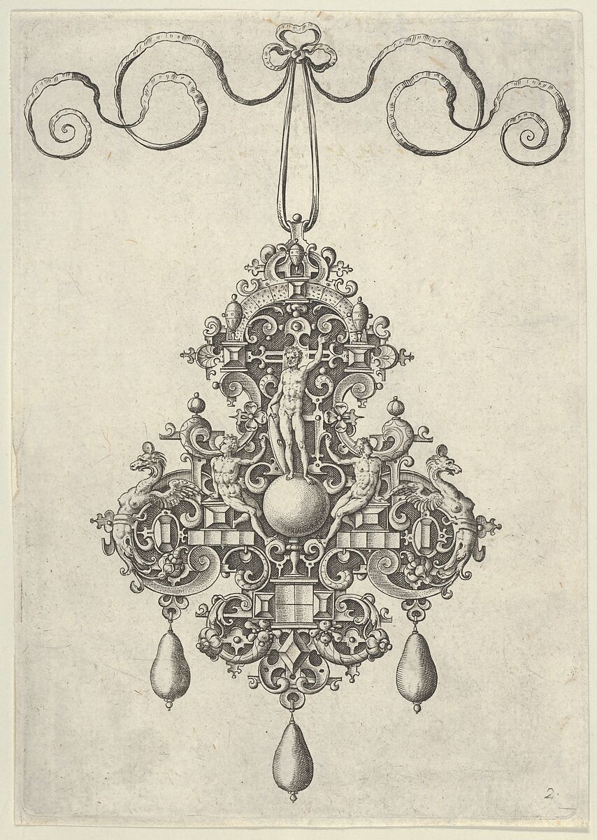 Vertical panel with a pendant design at center, with a male diety holding a shield to his right sight, and standing on an orb at center, surrounded by strapwork ornament and grotesques. To either side, two nude reclining male figures facing outwards towards dragon-headed grotesques. The ornament hangs from a ribbon and has three pearls descending from the bottom and left and right sides. Plate 2 from a set of ten plates with pendant designs, with deities and strapwork backgrounds. The first edition of the series was published in Antwerp by Philips Galle in 1581 and exists in two states; two later editions – the first published by Theodoor Galle after 1600 and the second by Johannes Galle after 1636 – were also produced in Antwerp. Jan Collaert I produced several series of plates with pendant designs, a practice continued by his son, Adriaen Collaert.