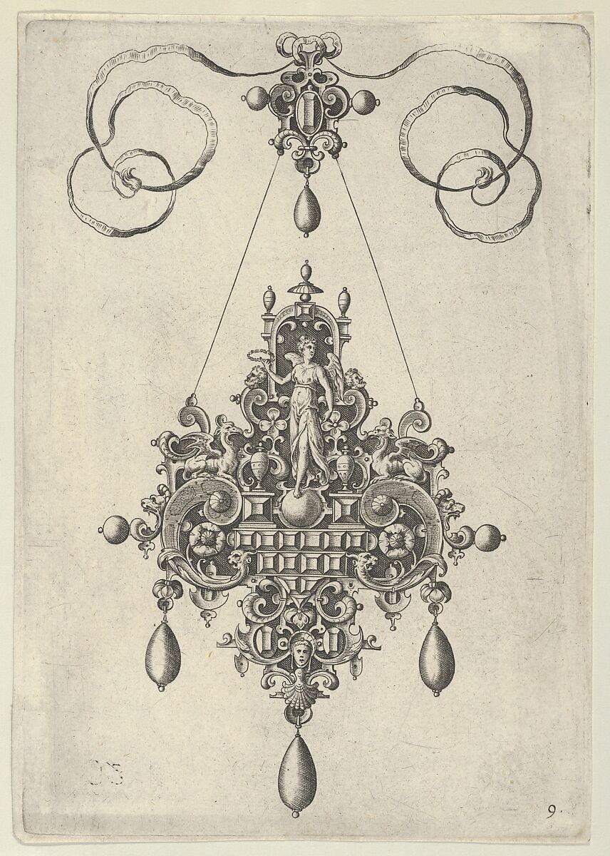 Vertical panel with a pendant design at center, with a winged female figure standing on an orb and holding up a laurel wreath in her right hand. The figure is set in a strapwork background and is flanked by inward-facing griffins. At the bottom of the ornament is a female mask with a headdress. Plate 9 from a set of ten plates with pendant designs, with deities and strapwork backgrounds. The first edition of the series was published in Antwerp by Philips Galle in 1581 and exists in two states; two later editions – the first published by Theodoor Galle after 1600 and the second by Johannes Galle after 1636 – were also produced in Antwerp. Jan Collaert I produced several series of plates with pendant designs, a practice continued by his son, Adriaen Collaert.