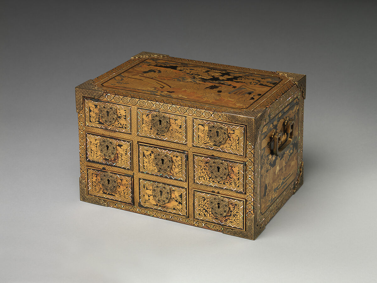 In the second half of the sixteenth century, Japanese lacquer made for Western markets was known as Nanban (Southern Barbarian) lacquer, a reference to the epithet given to foreigners from Spain, Portugal, and the Netherlands. Many of these export lacquers were made in Kyoto. Six-drawer cabinets of this type, listed in European collections as secrétaires or comptoiren, would generally have had a fall-front door. One of the earliest examples of an export cabinet without a fall front was inventoried at Schloss Ambras in Austria, around 1607. The drawer fronts of this sumptuous, small, and richly embellished cabinet are densely decorated with autumn flowers and shells, while geometric patterns, floral designs, and repeated intersecting-circle motifs (shippo) embellish the dividers. The top and sides display complex compositions inspired by Japanese literary classics. The unusual size and iconography of the cabinet indicate that it could have been a special order.