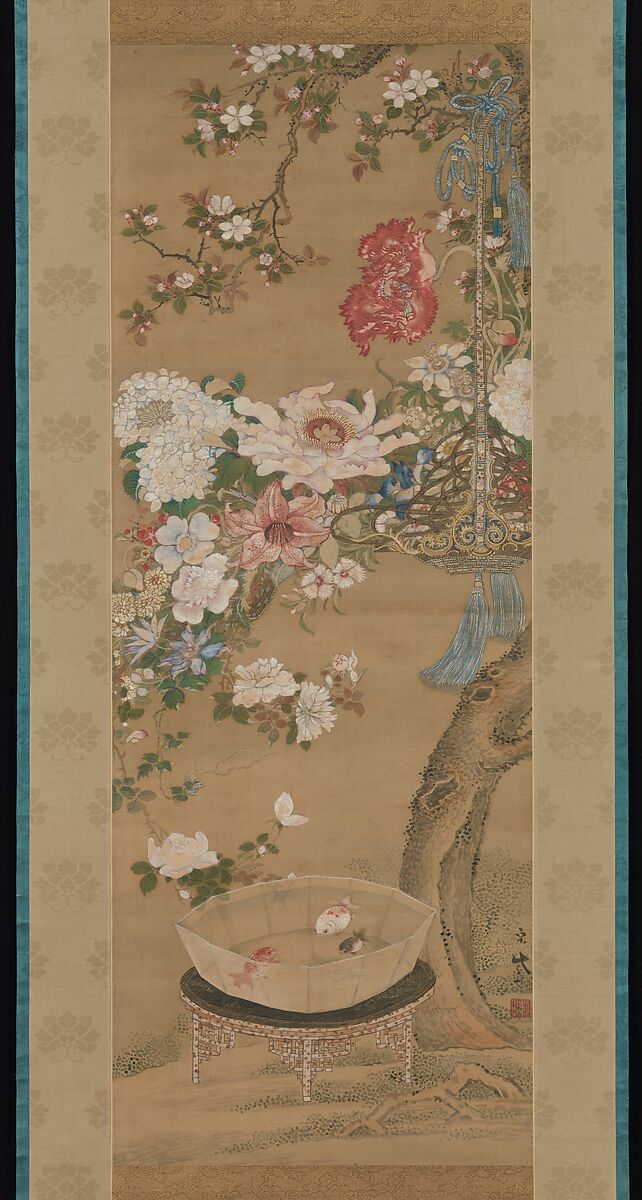 The profusion of flowers hanging from a kaido tree, ebulliently filling the frame, suggests fecundity. The auspicious and opulent qualities of this painting are enhanced by such exotic motifs as the basket, the finely crafted table, and the delicate glass fishbowl. The meticulous details and realistic coloring are in line with the decorative realism taught by Sō Shizan’s father, Sō Shiseki, who trained with the Chinese painter Song Ziyuan. His style is also influenced by the work of Shen Nanpin.