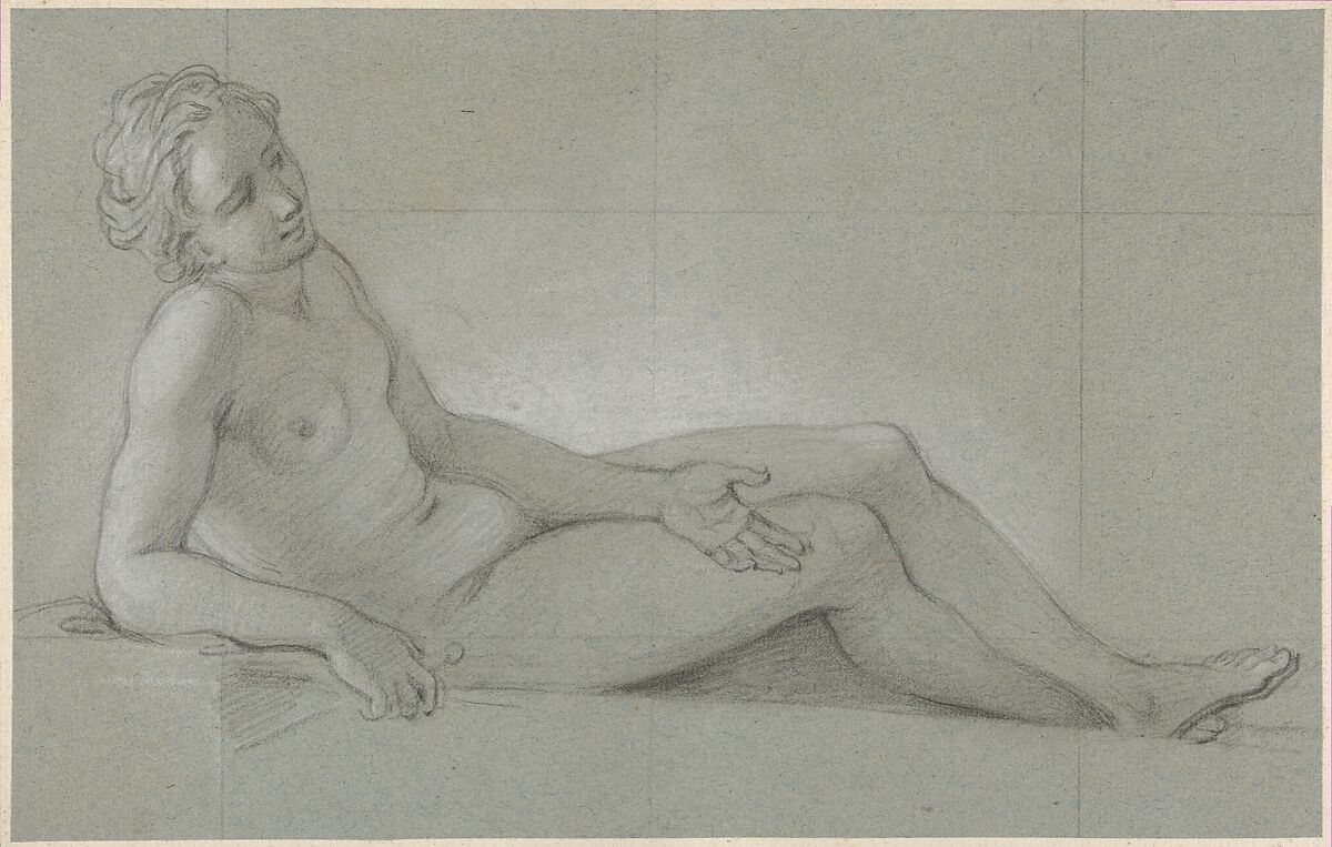 - Medium: Black chalk and stumping, heightened with white chalk, on blue paper; squared in black chalk