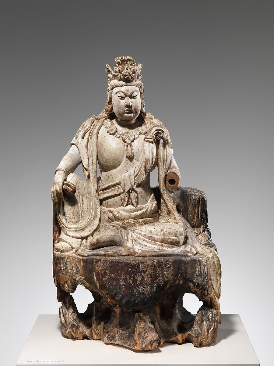 This substantial figure of the bodhisattva Avalokiteshvara, once part of a set of three Buddhist icons, can be securely dated by an inscription. The inscription states that the sculpture was created by carving master Feng Xiaozhong and his son and placed in a temple to protect a road and that the residents of Dong’an prefecture (modern Anci county, Hebei province), together with senior monk Xin Zhongwen, commissioned the temple and sculpture in 1385. The inscription is on the interior surface of a wooden panel that covers a small chamber in the back of this figure. The chamber once held consecratory offerings, such as Buddhist texts or jewelry.