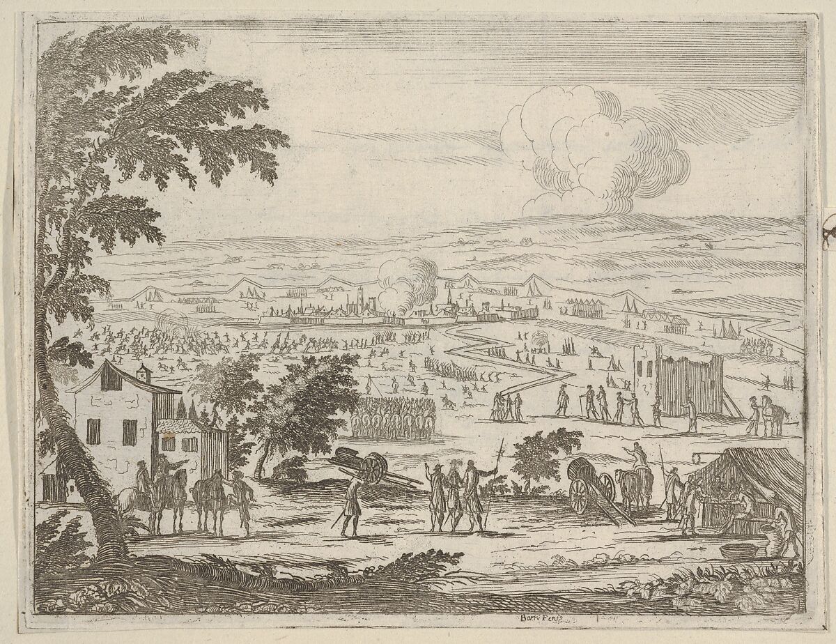 This print is from L'Idea di un Principe ed Eroe Cristiano in Francesco I d'Este, di Modena e Reggio Duca VIII [...] collected in an album of brown boards. Four prints are hinged on each page of the album with a seventeenth- or eighteenth-century inscription pasted beneath the print on the album page. The prints are etched in the manner of Callot and illustrate Francesco I d'Este's virtuous nature as a ruler in battle, in religious matters, and in daily life. Three of the prints are signed by Jean Sauvé, who presumably worked with Fenice on the execution of the illustrations for this book. There are sixty-seven copper plates and forty-five preparatory drawings in the Museo Civico di Modena.