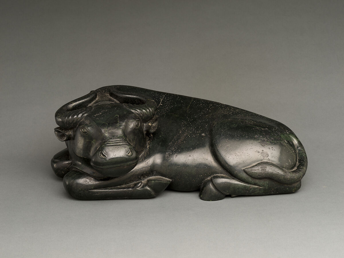 Ingeniously shaped out of a massive dark green nephrite boulder from the riverbed of Yarkand, in northwestern China, this sculpture weighs more than forty pounds. The cunning naturalistic details, including a whorl of hair on the animal’s forehead, demonstrate the observant eye of a master carver in the eighteenth century.