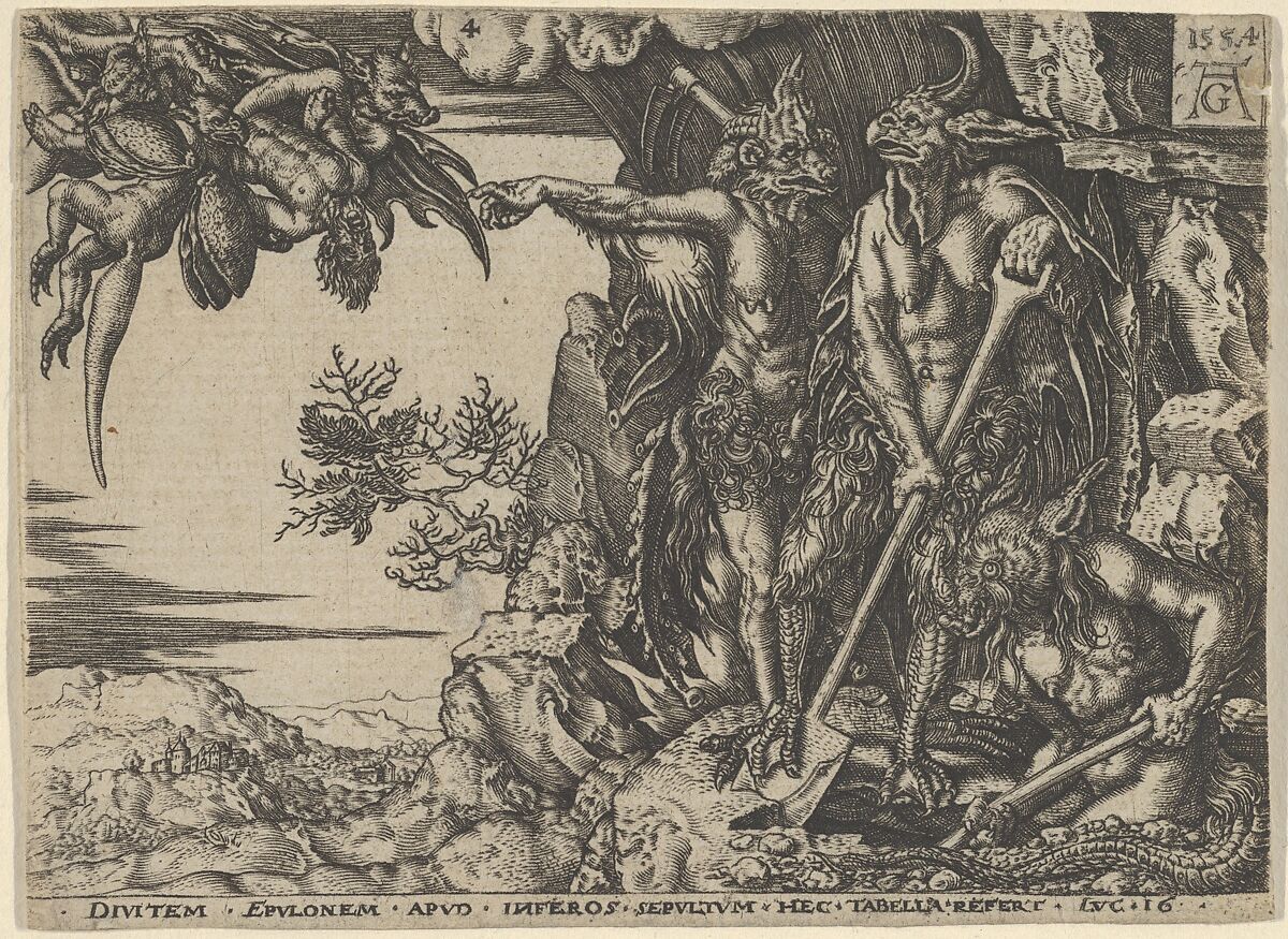 The rich man carried by winged demons at upper left, above a landscape with a city in the background below. At right, three demons with shovels digging a hole. The demon at left gestures towards the group of flying figures. Plate 4 from a series of five prints with scenes from Luke 16:19–31.