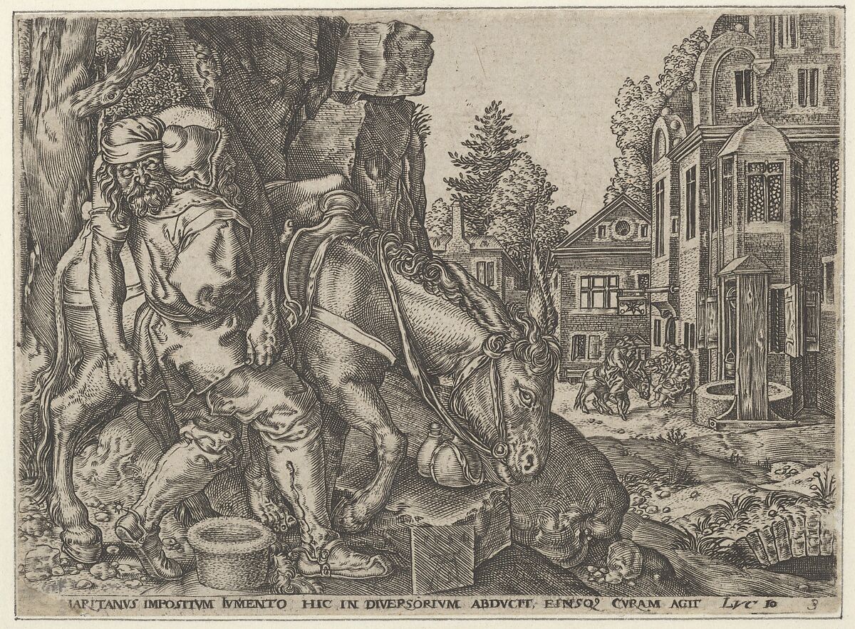 At left, the Good Samaritan lifts the limp body of the traveller onto the donkey. In the background at right, the inn with figures out front and a well. Plate 3 from a series of four engravings depicting Luke 10:30–35.