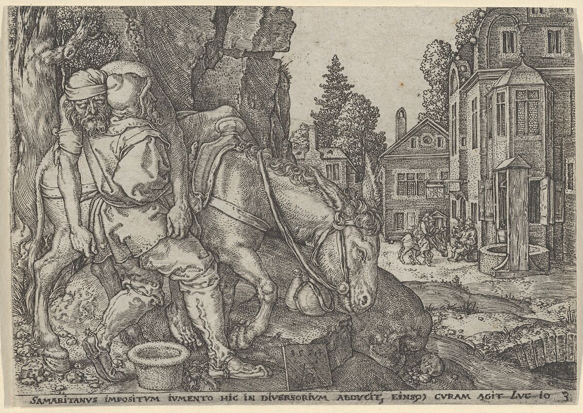 At left, the Good Samaritan lifts the limp body of the traveller onto the donkey. In the background at right, the inn with figures out front and a well. Plate 3 from a series of four engravings depicting Luke 10:30–35.