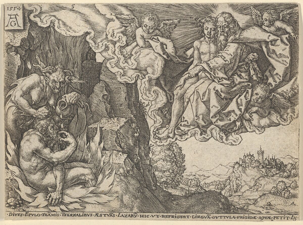 At left, the rich man is engulfed in flames while the devil grabs his hair and pours liquid on him from a pitcher. At right, Lazarus, Abraham, and three angels in a cloud burst above a landscape. Plate 5 from a series of five prints with scenes from Luke 16:19–31.