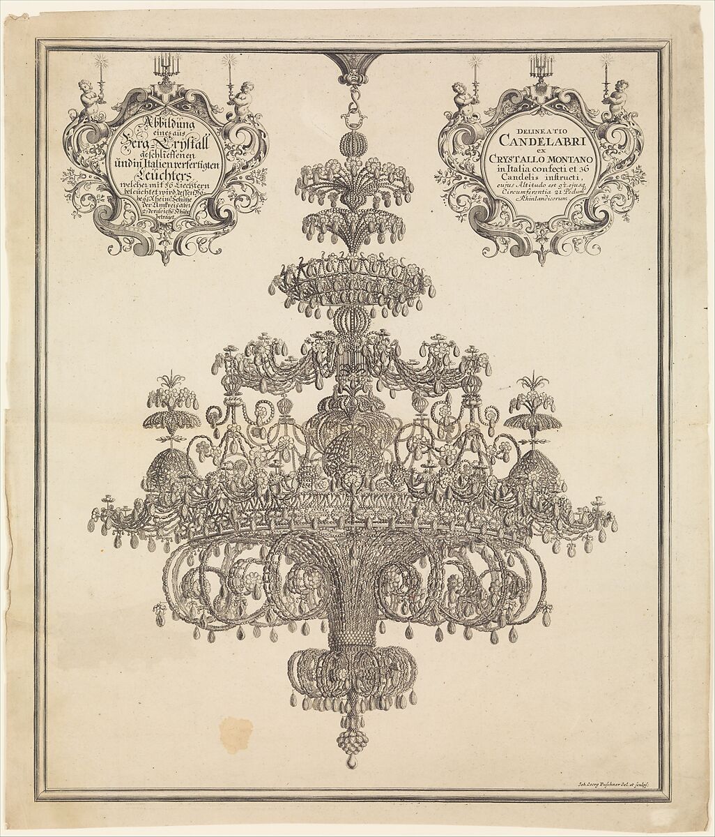 Design for a rock crystal chandelier, produced in Italy (Milan). According to the inscription, added both in German and Latin, the chandelier supports 36 candles and is 9 1/2 Rhinish feet high while its circumference measures 21 Rhinish feet. The chandelier hung in the house chapel of the Peller family in Nuremberg. It was originally commisioned in Italy (ca. 1694) as a gift for the princely house of Thurn and Taxis. The merchant family Peller acted as an intermediate in this commission and when no agreement was reached over the final price of the chandelier they kept it in their house. Eventually they sold it to the Prussian King who had it restored and hung in the 'Rittersaal' in Berlin.