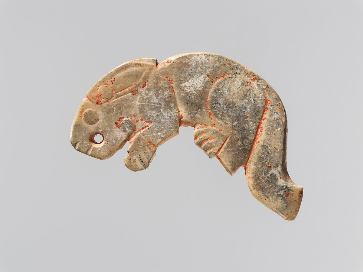 This jade carving is among the earliest representations of a rabbit created during China’s Bronze Age. The plaque’s compact size and its small hole suggest that it was probably used as a pendant.