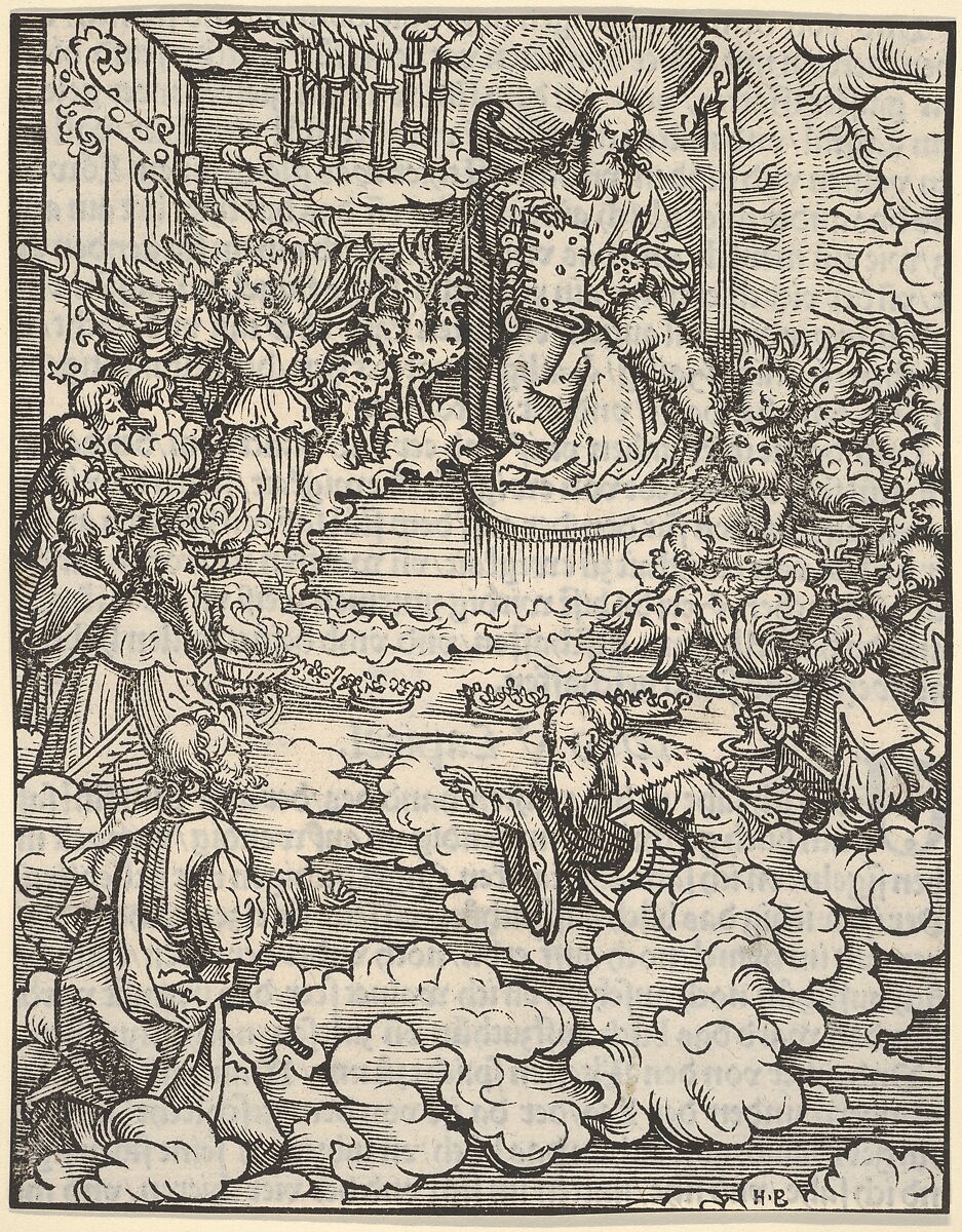 Plate 2 from a series of 21 woodcuts with scenes from the Apocalypse for Martin Luther's translation of the New Testament. Four editions were published in Augsburg by Silvan Otmar between March 1523 and April 1524.