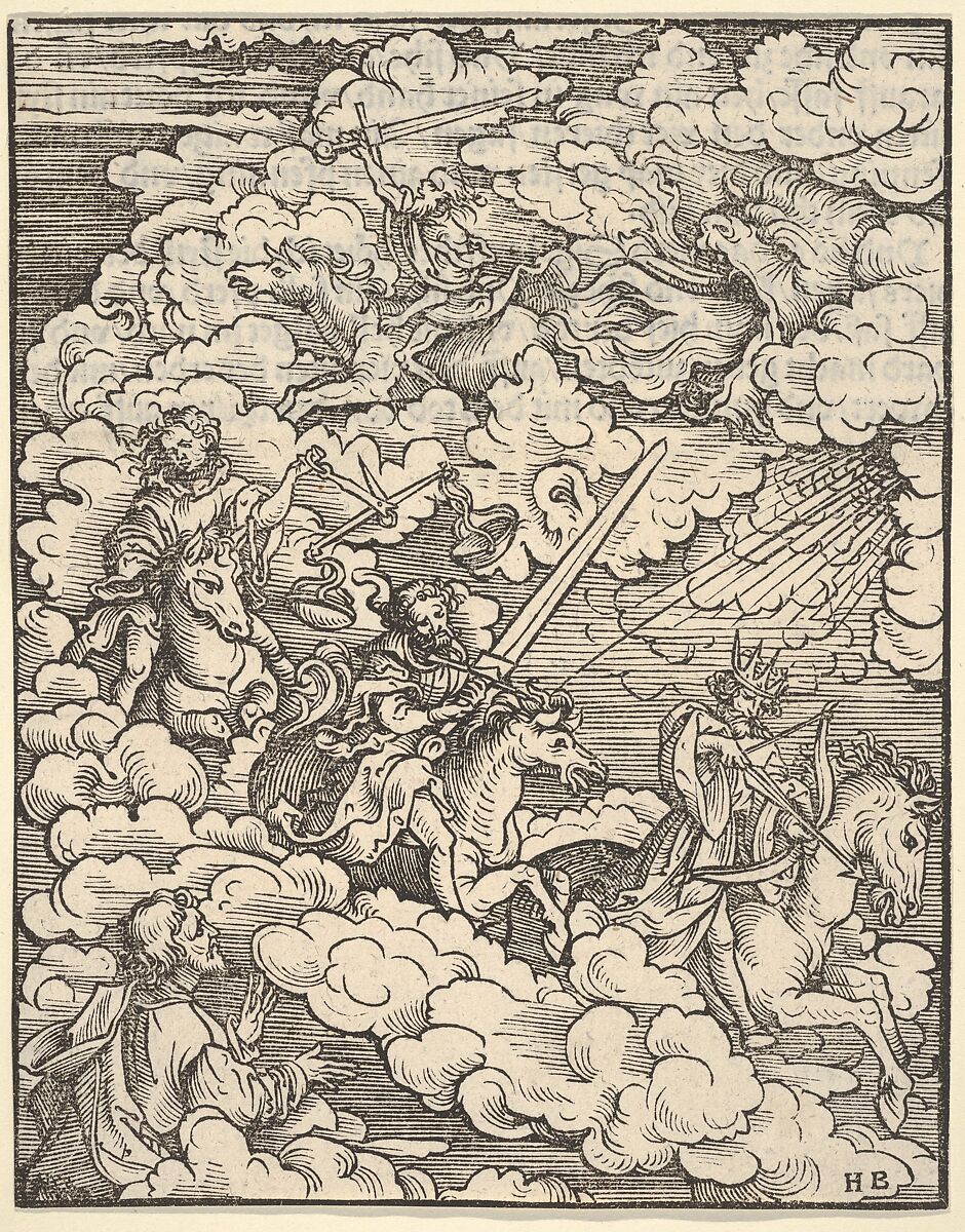 Plate 3 from a series of 21 woodcuts with scenes from the Apocalypse for Martin Luther's translation of the New Testament. Four editions were published in Augsburg by Silvan Otmar between March 1523 and April 1524.