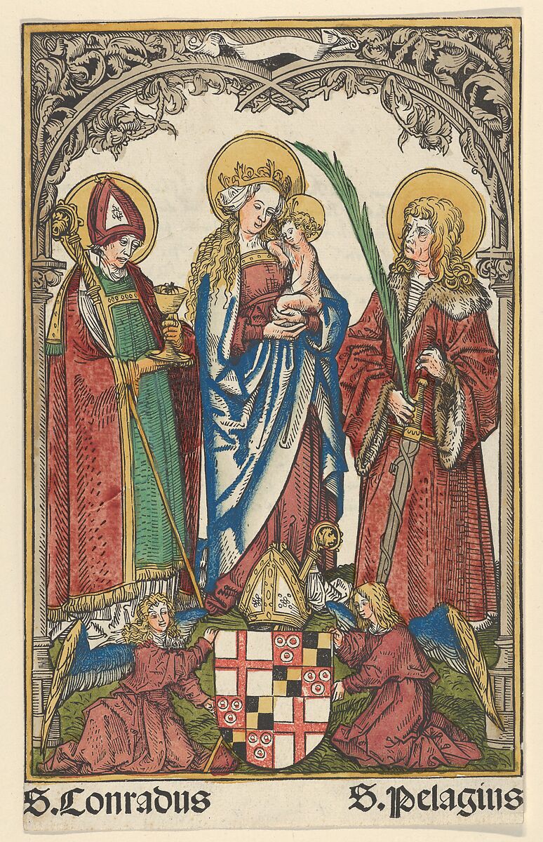 At center, the Virgin, holding the Christ Child under an arch, is flanked by Saint Conrad at left and Saint Pelagius at right. Below, two angels support the coat of arm of Bishop Hugo of Hohenlandenberg. This second state was used as the frontispiece of the Constance Missal (Missale Constantiense) published by Erhard Ratdolt in Augsburg on October 8, 1505. The first state, in which Pelagius has a beard and hat and the date 1499 appears at bottom center, was also used as a frontispiece, as part of the Breviarium Constantiense published by Ratdolt in 1499.