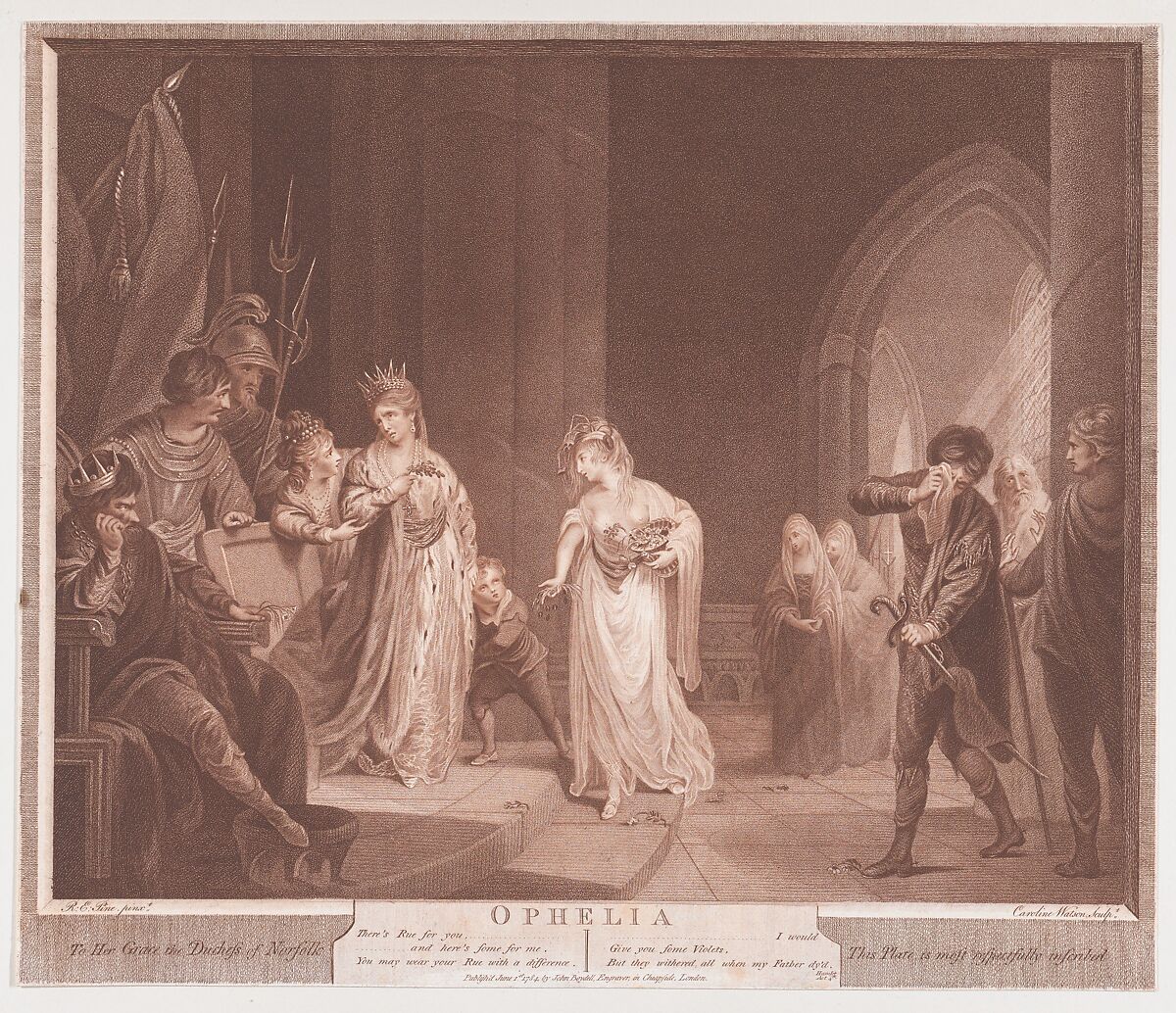 Ophelia appears here, her mind unhinged by the murder of her father and rejection by Hamlet. In Act 4 of Shakespeare's play she appears crowned with weeds and flowers, singing pathetically, and distributing herbs to members of the court whom she no longer recognizes. The related painting by Pine was shown in April 1782, with six other subjects from Shakespeare, at the Great Room in Spring-Gardens with plans announced for engravings "in the chalk manner," by Caroline Watson and Victor Marie Picot. After Pine departed for America, Boydell bought the plates and reissued this version of the print.