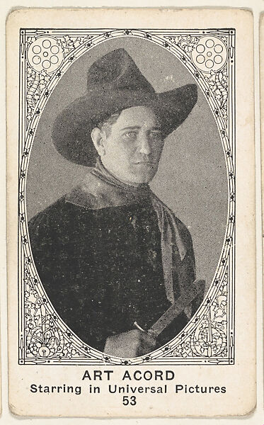 - Title:Card 53, Art Acord, Starring in Universal Pictures, from the Movie Actors and Actresses series (E123), issued by the American Caramel Company