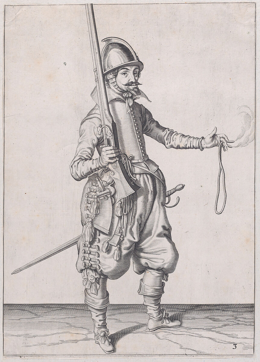 From a series of 117 numbered plates from the military drill manual, "Wapenhandelinghe van Roers Musquetten ende Speissen" (The Exercise of Arms). The series is divided into three sets: Marksmen (42 plates), Musketeers (43 plates), and Lansquenets (32 plates). The Exercise of Arms was first published as a complete volume in 1608, and several more editions followed shortly after, with Dutch, French, German, English, and Danish versions produced. This version (49.95.1110-1227) belongs to the German translation of the third edition (titled "Waffenhandlung von den Rören Musquetten undt Spiessen"), which was published in The Hague in 1608.