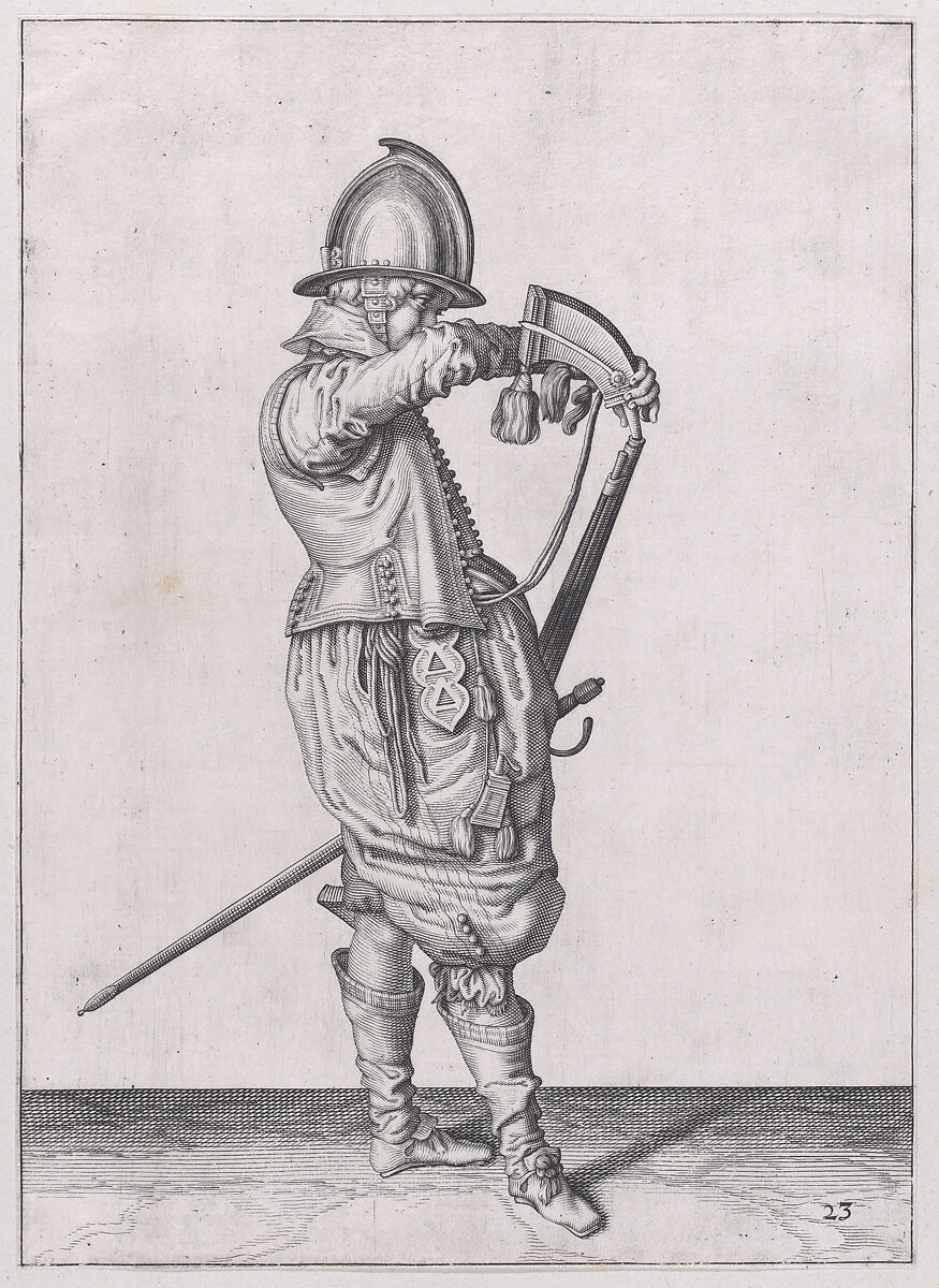 - Title: A soldier charging his caliver which is held stock down, from the Marksmen series, plate 23, in "Waffenhandlung von den Rören Musquetten undt Spiessen / Wapenhandelinghe van Roers Musquetten ende Spiessen" (The Exercise of Arms)