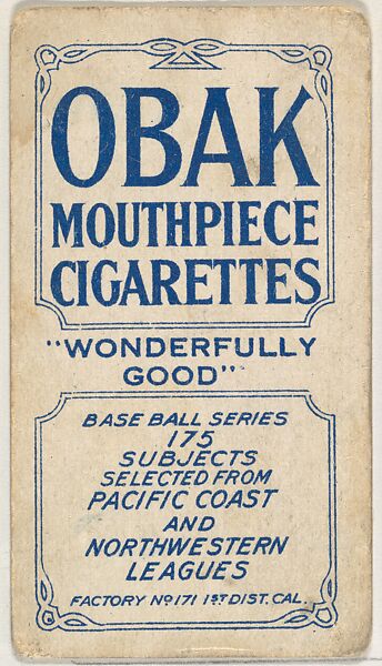 - Title:Card Verso, from the "Obak Baseball Players" set (T212), issued by the American Tobacco Company to promote Obak Mouthpiece Cigarettes