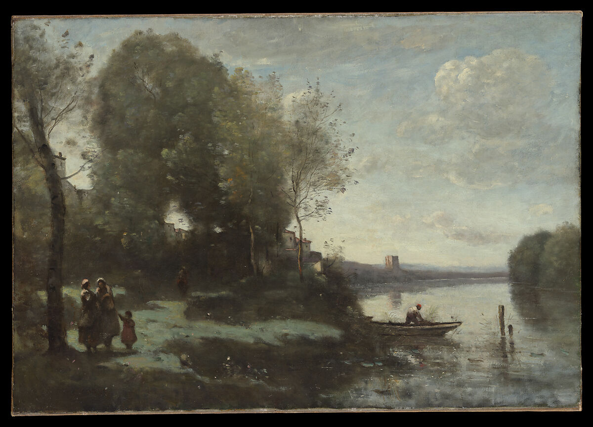 The writer Théophile Thoré repeated his habitual criticism of Corot in 1865, the date of this picture: "Corot almost never made anything besides the same one landscape, but it is good." The landscape here was conceived by Corot in his studio from stock elements that he knew by heart: the cluster of silvery trees, the body of leaden water, the peasant figures and boatman, the distant tower. Like his idol Claude Lorrain, Corot could generate a landscape and a mood through the power of his imagination.