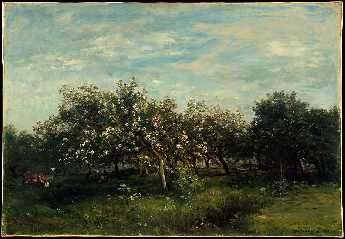 Critic Théophile Gautier extolled Daubigny’s landscapes as "pieces of nature cut out and set into golden frames." The artist first painted flowering orchards about 1857, reprising the motif almost every spring. His unpretentious subject matter, rendered with rapid, summary brushstrokes, soon earned the admiration of younger colleagues like Monet. By the time of this canvas in 1873, Daubigny, had, in turn, assimilated their high-keyed palette, evident in the vivid green foliage and bright blue sky. That same year, Monet painted two views of blossoming fruit trees, one of which is in the Metropolitan’s collection (26.186.1).