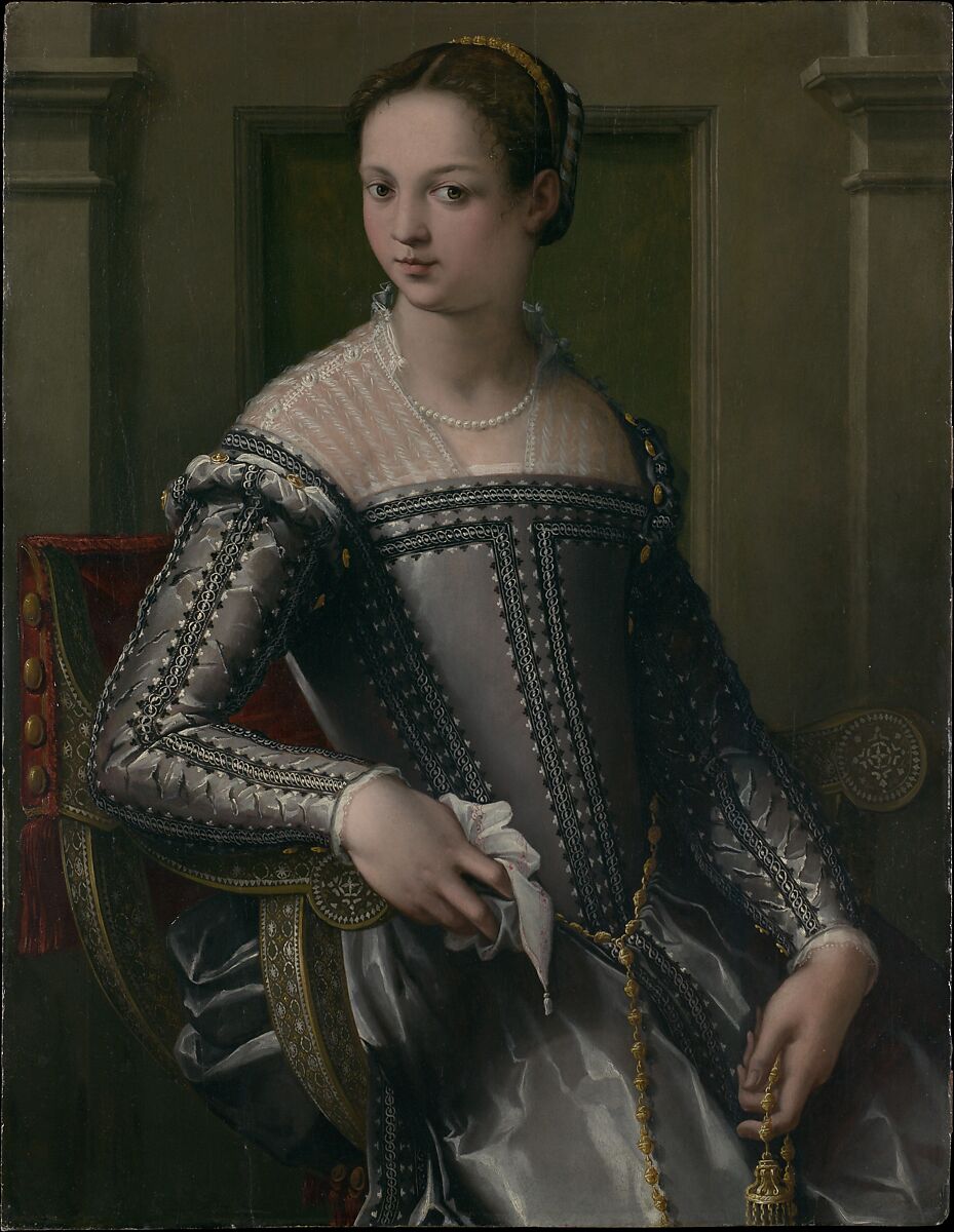 Seated in an elaborately decorated folding chair, this young woman is an image of self-possession and demure elegance (note her sidelong glance and the way she holds the linen handkerchief and the gold waist chain). The architectural background appears in many Florentine portraits of the period, complicating the attribution. It has recently been suggested that the picture was painted by the young Francesco Zucchi, who was employed in the decoration of the studiolo (private study) of Francesco de’ Medici in the Palazzo Vecchio in Florence. An assistant of Vasari, Zucchi later had a Roman career working for Cardinal Ferdinando de’ Medici.