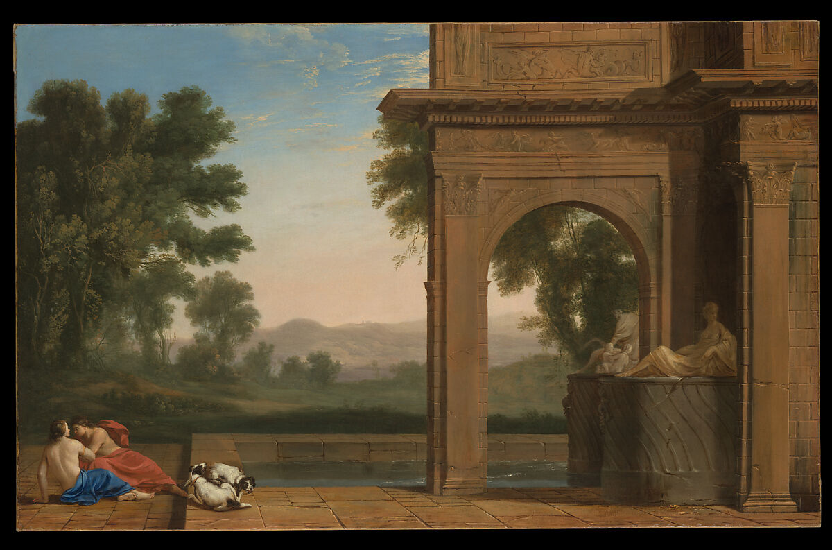 Having traveled to Rome in 1634, the French artist Mauperché returned to Paris five years later and became an important exponent of classical landscape painting. During the 1640s and 1650s his patrons were among the most powerful people in France. This painting is especially austere in its stagelike setting of classical architecture. The subject has not been identified, though a pointedly licentious echo seems to exist between the amorous couple and pair of dogs.