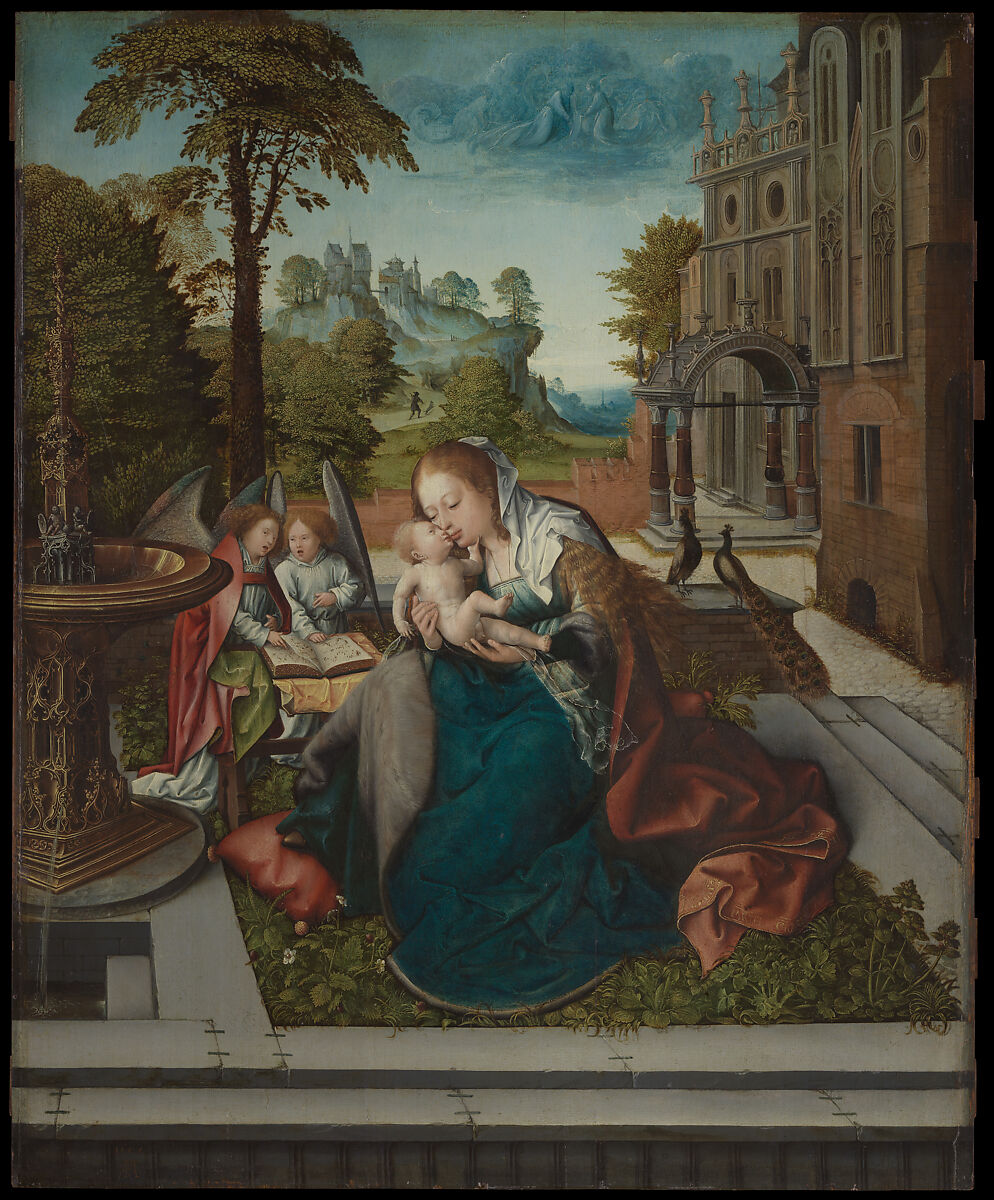 Van Orley probably painted this refined and intimate picture of the Virgin and Child about the time of his appointment in 1518 as official painter to Margaret of Austria, regent of the Netherlands. A courtly Madonna of Humility, the Virgin wears a luxurious fur-trimmed dress and is seated on the ground in the enclosed but spacious garden of her palace. She is accompanied by two singing angels, who are echoed by grisaille angels in heaven. The distant background testifies to the painter’s awareness of the development of landscape painting, and the elaborately ornamented fountain incorporates Italian Renaissance decorative motifs.