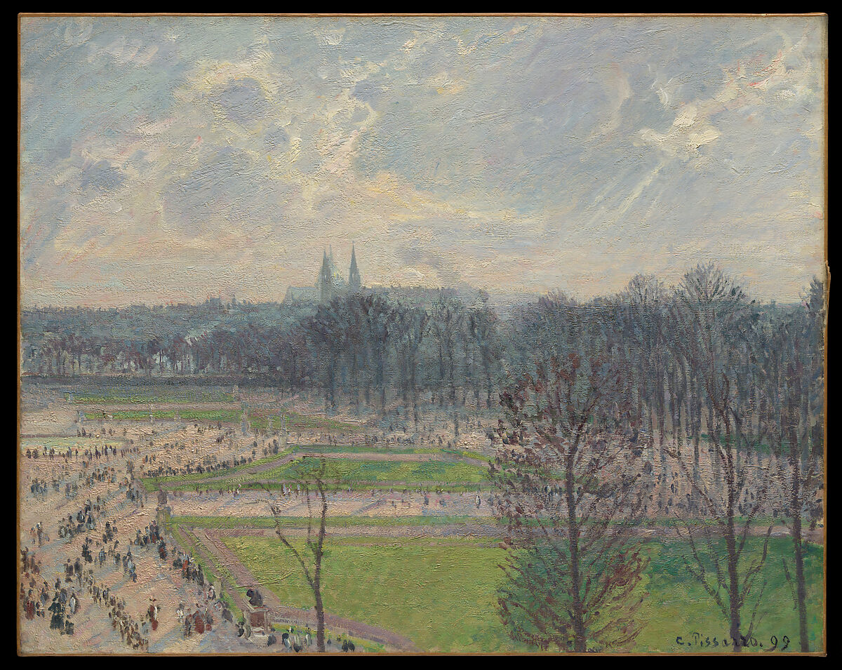 Pissarro rented a large apartment at 204 rue de Rivoli in Paris for the first half of 1899. From its windows facing the Jardin des Tuileries, he painted six views of the garden (including this work and two others in the Metropolitan), in which the twin steeples of the church of Sainte-Clotilde punctuate the vast expanse of sky. Attentive to changes in light, atmosphere, and climate, as well as to the comings and goings of strollers, at different times of day and seasons of the year, Pissarro was able to extract a variety of pictures from a single site.