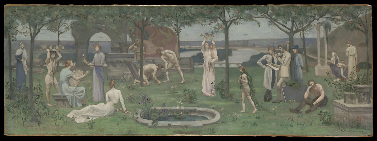 In a grove overlooking the Seine River, people paint ceramics and excavate architectural fragments while art students look on at the right. This tribute to creative endeavor is a small-scale copy of the central panel of a triptych that Puvis painted for the Musée des Beaux-Arts in Rouen. His comrade, the sculptor Auguste Rodin, praised the "sweet serenity" of scenes like this one, "sublime landscapes in which sacred nature nurtures a loving, wise, dignified, and pure humanity."
